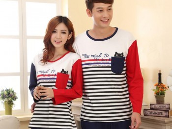 休闲情侣睡衣 秋季时尚长袖条纹棉质女士男人家居服套装秋款批发