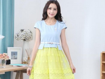 2014夏季新款韩版女装牛仔拼接欧根纱面料连衣裙牛仔裙