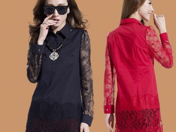 2015春装新款女装 韩版时尚拼接纯色修身翻领蕾丝连衣裙直销
